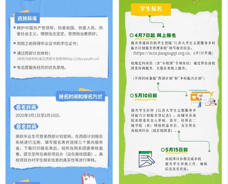 志愿点亮乡野,青春筑梦振兴。2025年“西部计划”“江苏大学生志愿服务乡村振兴计划”志愿者招募火热进行中,校团委积极开展校地定向共建,全方位、多渠道推进招募宣传工作,教育和引导KY开元应届毕业生将个人理想有机融入国家西部与基层建设,让他们深刻认识到投身“西部计划”“江苏大学生志愿服务乡村振兴计划”不仅是个人成长的契机,更是时代赋予的使命担当。在基层的广阔天地中,以青春之我、奋斗之我,为乡村振兴和西部发展添砖加瓦,让青春在党和人民最需要的地方绽放绚丽之花。