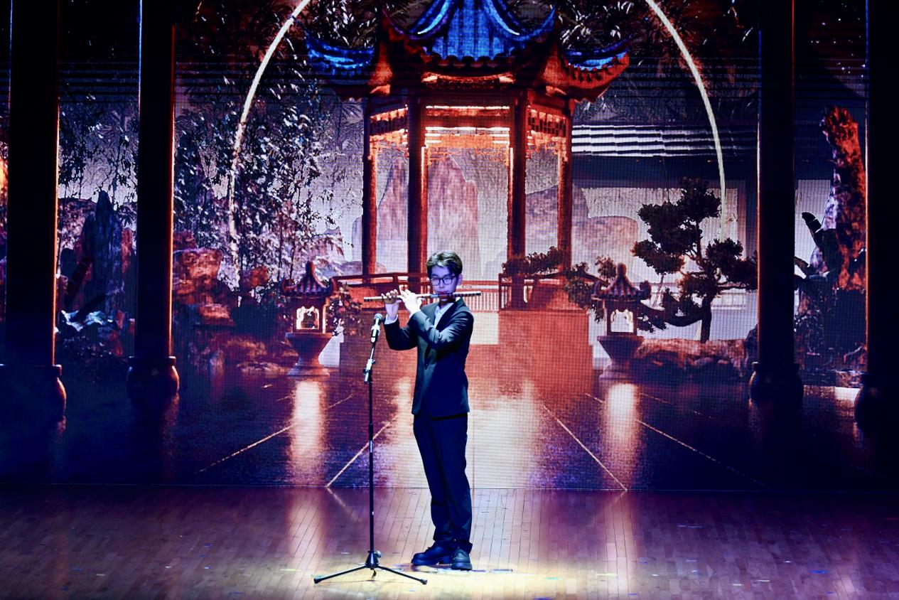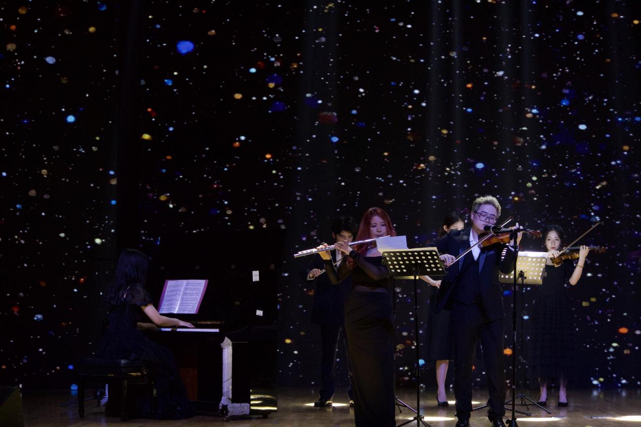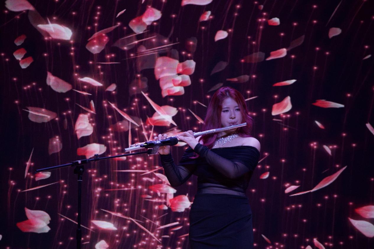 民乐合奏《寄明月》率先登场,丝竹管弦交织,似将朦胧月色与缱绻情思融入旋律,带领观众踏入诗意的月夜幻境。古筝独奏《定风波》中,演奏者指尖起落间,古朴的琴音裹挟着旷达豪情,演绎出 “一蓑烟雨任平生” 的洒脱。竹笛曲《姑苏行》婉转悠扬,笛声如潺潺流水,勾勒出苏州园林的典雅与江南水乡的温婉。扬琴独奏《红河的春天》旋律明快热烈,清脆的扬琴声仿佛奏响了红河两岸万物复苏的生机。古筝重奏《采薇》以灵动多变的节奏,重现了《诗经》中戍卒的思乡之情,琴音如诉。二胡合奏《战马奔腾》气势雄浑,弓弦震颤间,万马嘶鸣、驰骋疆场的壮阔画面跃然眼前。小提琴重奏《一步之遥》与《笼》风格迥异,前者探戈节奏热情奔放,后者旋律细腻深沉,展现出弦乐的多样魅力。钢琴独奏《华尔斯坦奏鸣曲》音符如珠落玉盘,激昂与舒缓交织,尽显古典音乐的磅礴气势。西乐重奏《加勒比海盗》以宏大的旋律,营造出惊心动魄的冒险氛围,将现场气氛推向高潮。