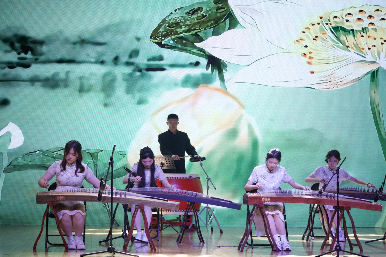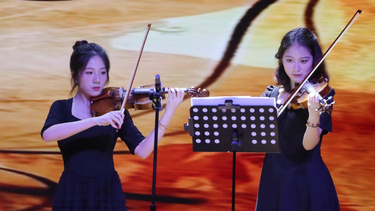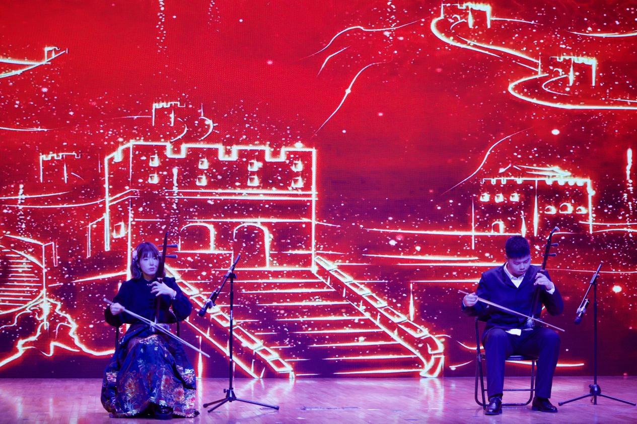 民乐合奏《寄明月》率先登场,丝竹管弦交织,似将朦胧月色与缱绻情思融入旋律,带领观众踏入诗意的月夜幻境。古筝独奏《定风波》中,演奏者指尖起落间,古朴的琴音裹挟着旷达豪情,演绎出 “一蓑烟雨任平生” 的洒脱。竹笛曲《姑苏行》婉转悠扬,笛声如潺潺流水,勾勒出苏州园林的典雅与江南水乡的温婉。扬琴独奏《红河的春天》旋律明快热烈,清脆的扬琴声仿佛奏响了红河两岸万物复苏的生机。古筝重奏《采薇》以灵动多变的节奏,重现了《诗经》中戍卒的思乡之情,琴音如诉。二胡合奏《战马奔腾》气势雄浑,弓弦震颤间,万马嘶鸣、驰骋疆场的壮阔画面跃然眼前。小提琴重奏《一步之遥》与《笼》风格迥异,前者探戈节奏热情奔放,后者旋律细腻深沉,展现出弦乐的多样魅力。钢琴独奏《华尔斯坦奏鸣曲》音符如珠落玉盘,激昂与舒缓交织,尽显古典音乐的磅礴气势。西乐重奏《加勒比海盗》以宏大的旋律,营造出惊心动魄的冒险氛围,将现场气氛推向高潮。