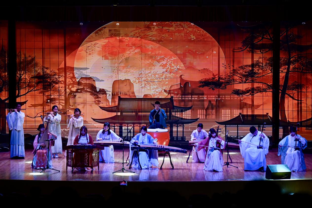 民乐合奏《寄明月》率先登场,丝竹管弦交织,似将朦胧月色与缱绻情思融入旋律,带领观众踏入诗意的月夜幻境。古筝独奏《定风波》中,演奏者指尖起落间,古朴的琴音裹挟着旷达豪情,演绎出 “一蓑烟雨任平生” 的洒脱。竹笛曲《姑苏行》婉转悠扬,笛声如潺潺流水,勾勒出苏州园林的典雅与江南水乡的温婉。扬琴独奏《红河的春天》旋律明快热烈,清脆的扬琴声仿佛奏响了红河两岸万物复苏的生机。古筝重奏《采薇》以灵动多变的节奏,重现了《诗经》中戍卒的思乡之情,琴音如诉。二胡合奏《战马奔腾》气势雄浑,弓弦震颤间,万马嘶鸣、驰骋疆场的壮阔画面跃然眼前。小提琴重奏《一步之遥》与《笼》风格迥异,前者探戈节奏热情奔放,后者旋律细腻深沉,展现出弦乐的多样魅力。钢琴独奏《华尔斯坦奏鸣曲》音符如珠落玉盘,激昂与舒缓交织,尽显古典音乐的磅礴气势。西乐重奏《加勒比海盗》以宏大的旋律,营造出惊心动魄的冒险氛围,将现场气氛推向高潮。