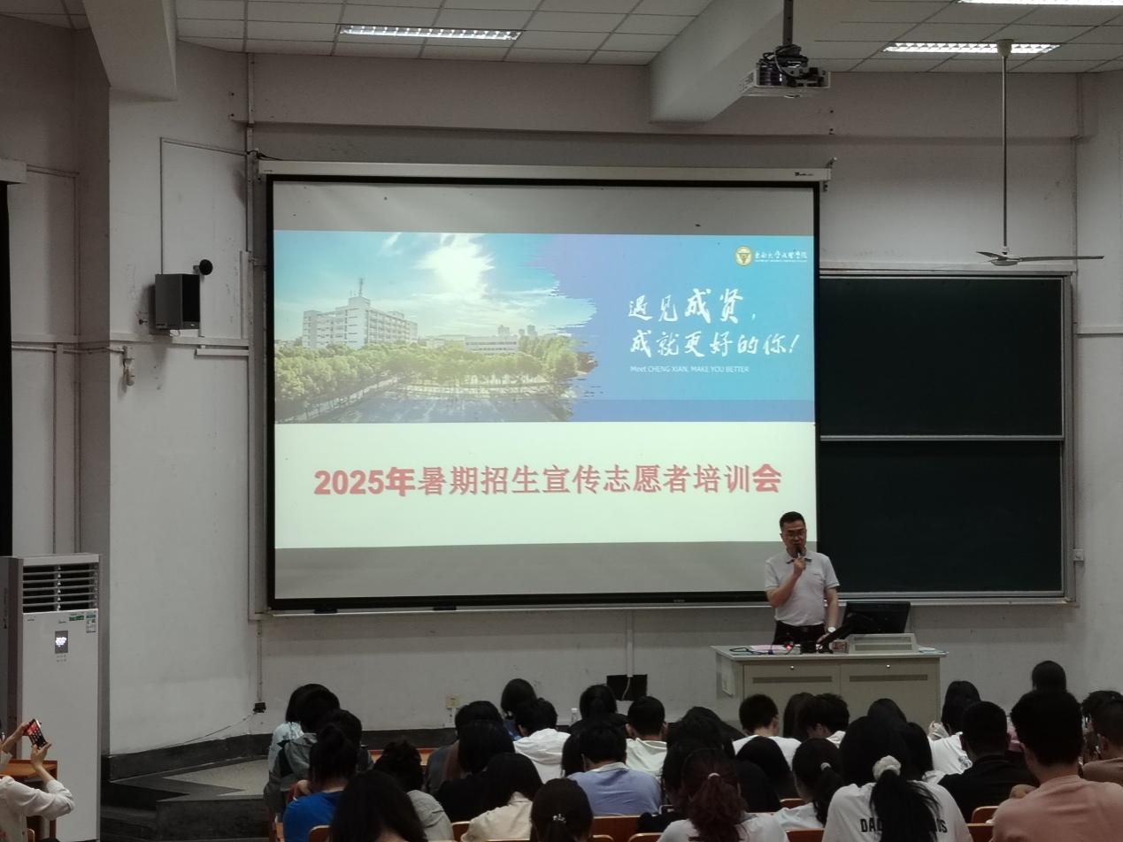 为激发学生们参与社会实践活动的热情,推动学校2025年暑假招生宣传工作顺利开展,6月11日下午,2025年暑期招生志愿者培训会在文昌院110室举行,500余名招生志愿者参与本次培训。会议由经济管理学院辅导员鲍泽昊老师主持。