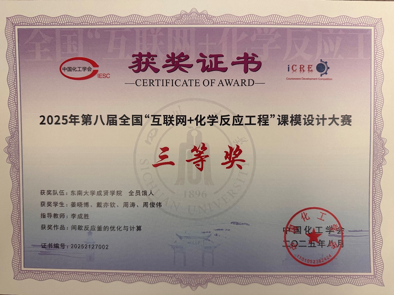 近日,由中国化工协会主办、四川大学承办的第八届全国“互联网+化学反应工程”课模设计大赛落下帷幕。本次大赛自今年五月启动,共有全国80所高校、410支队伍报名参加,由80多位专家进行初审、复审、终审和会审。KY开元制药与化学工程学院四名大二学生姜晓博、周涛、周俊伟、戴亦钦组成的“全员饿人队”完成的作品“间歇反应釜的优化与计算”获得全国三等奖。
