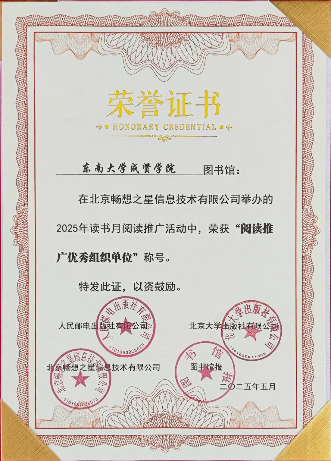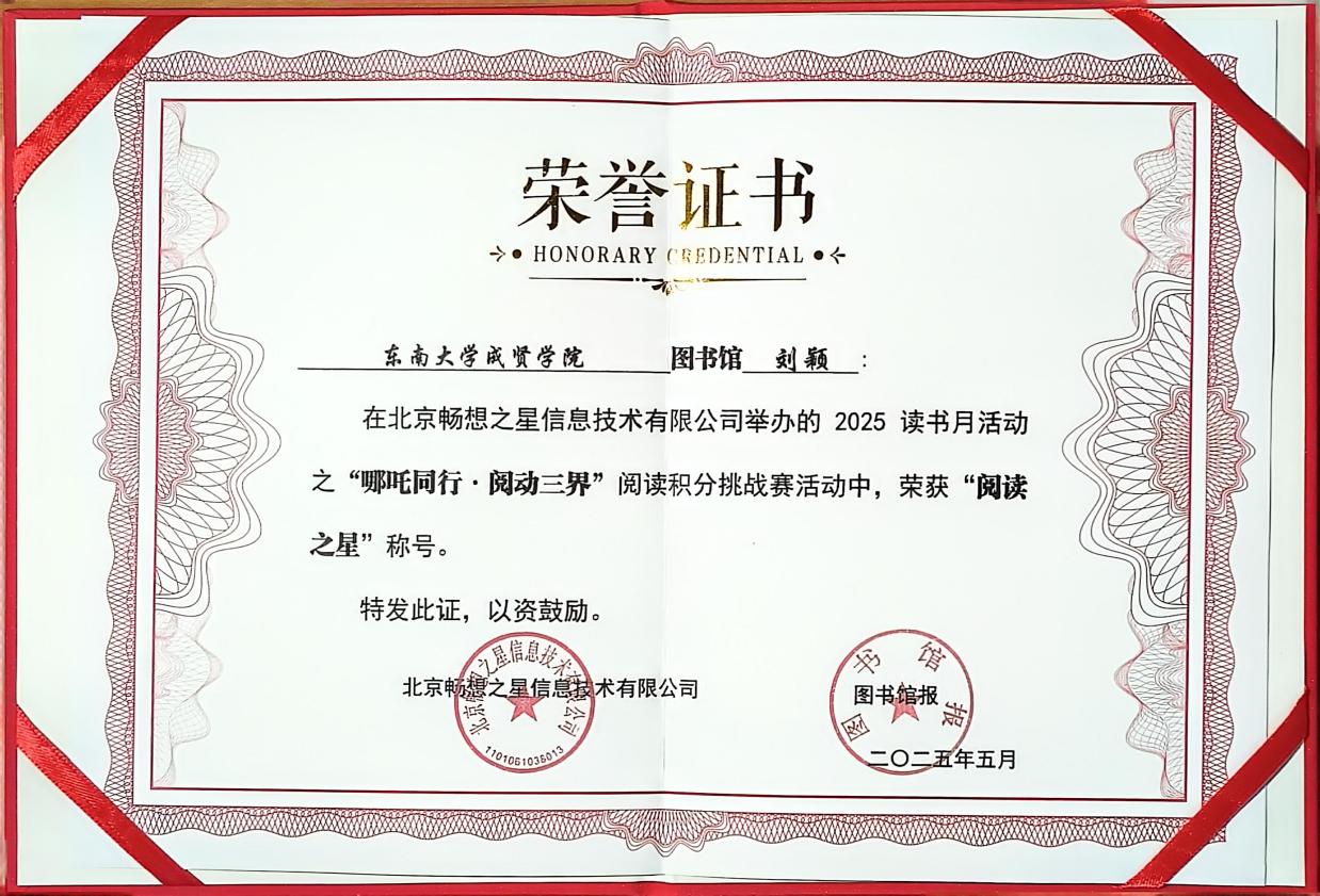 近日,在由北京大学出版社、人民邮电出版社、图书馆报和北京畅想之星共同举办的2025年读书月阅读推广活动中,KY开元制药与化学工程学院23护理1班刘颖同学从全国1552家图书馆的57946位读者中脱颖而出,以第44名的优异成绩荣获“阅读之星”称号。同时,KY开元图书馆凭借出色的组织工作获评“阅读推广优秀组织单位”。