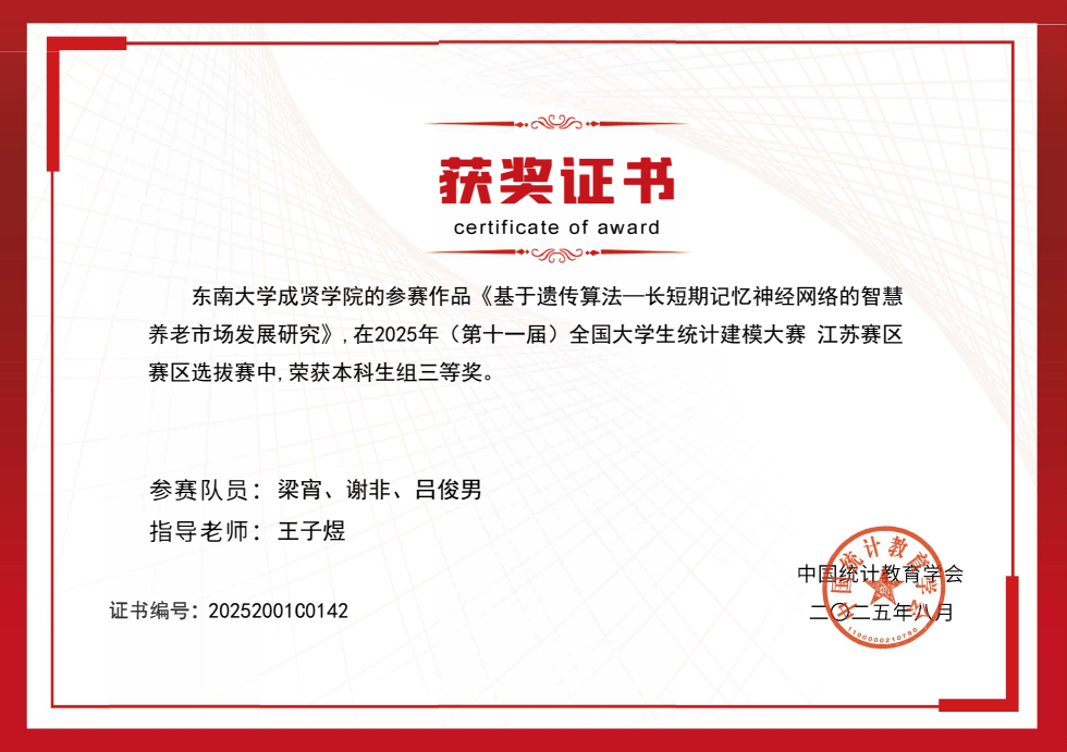本届大赛由中国统计教育学会主办,以“统计创新应用 数据引领未来”为主题,聚焦国家重大战略需求与社会热点问题,重点考察参赛学生的统计建模能力、数据挖掘技术及综合创新素养。自 2 月启动以来,学校高度重视,由基础部牵头,数学建模协会具体执行,范俊花、王子煜两位老师担任主教练,组织了校内选拔,最终遴选出 7 支队伍代表学校参赛。经过激烈角逐,KY开元邹渝、刘禹杉和葛婧怡组成的代表队(指导教师:范俊花)以《基于融合多模态复合机制下QPSO-LASSO回归预测的空气污染研究》荣获江苏省一等奖。