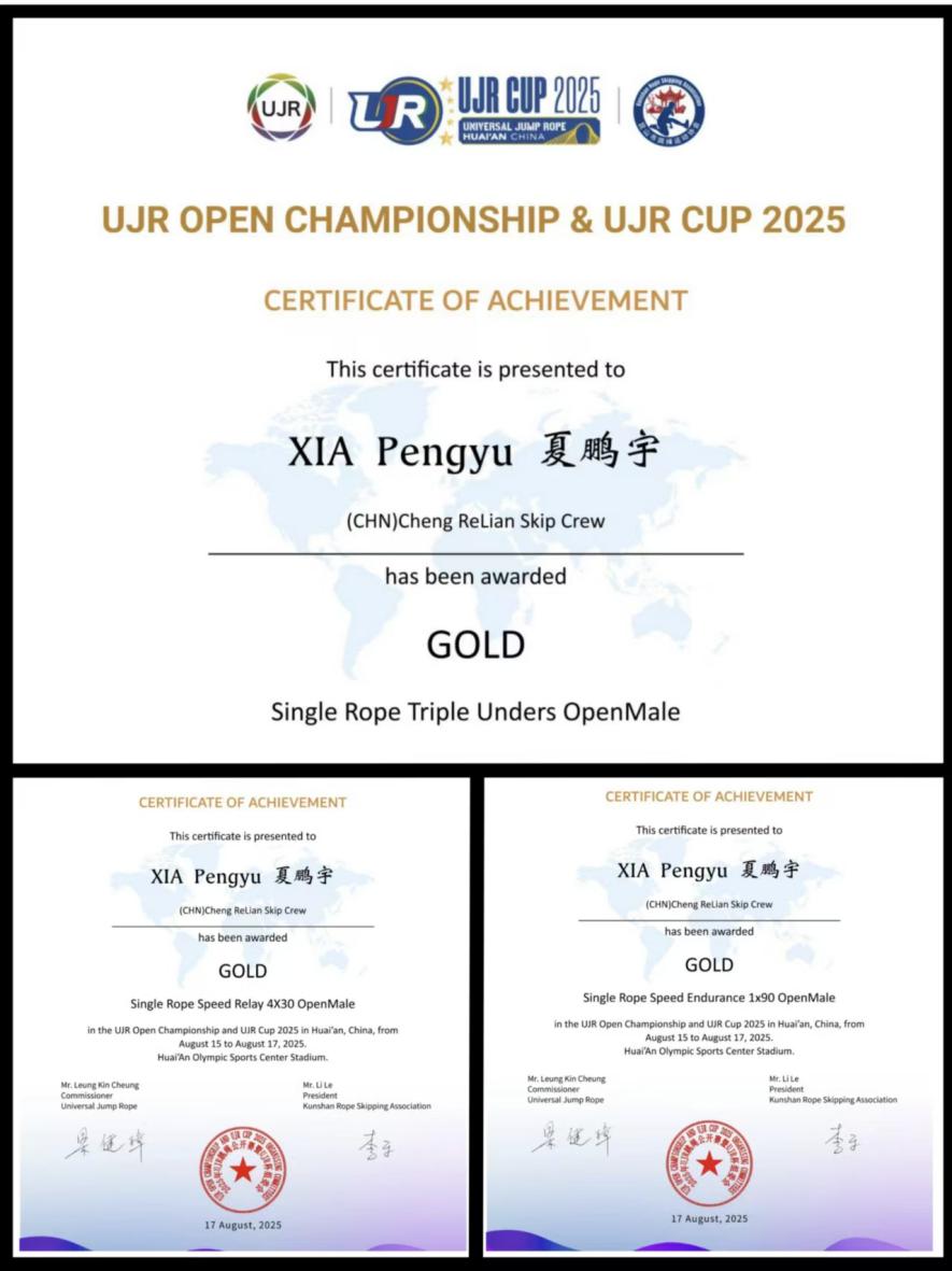 8月23日,世界跳绳公开赛(UJR)在江苏淮安奥体中心落下帷幕。KY开元2023级学子夏鹏宇代表国家队出征,在强手如林的赛场上,勇夺“4*30秒单摇”、“连续三摇跳”、“90秒单摇”三个项目的金牌。