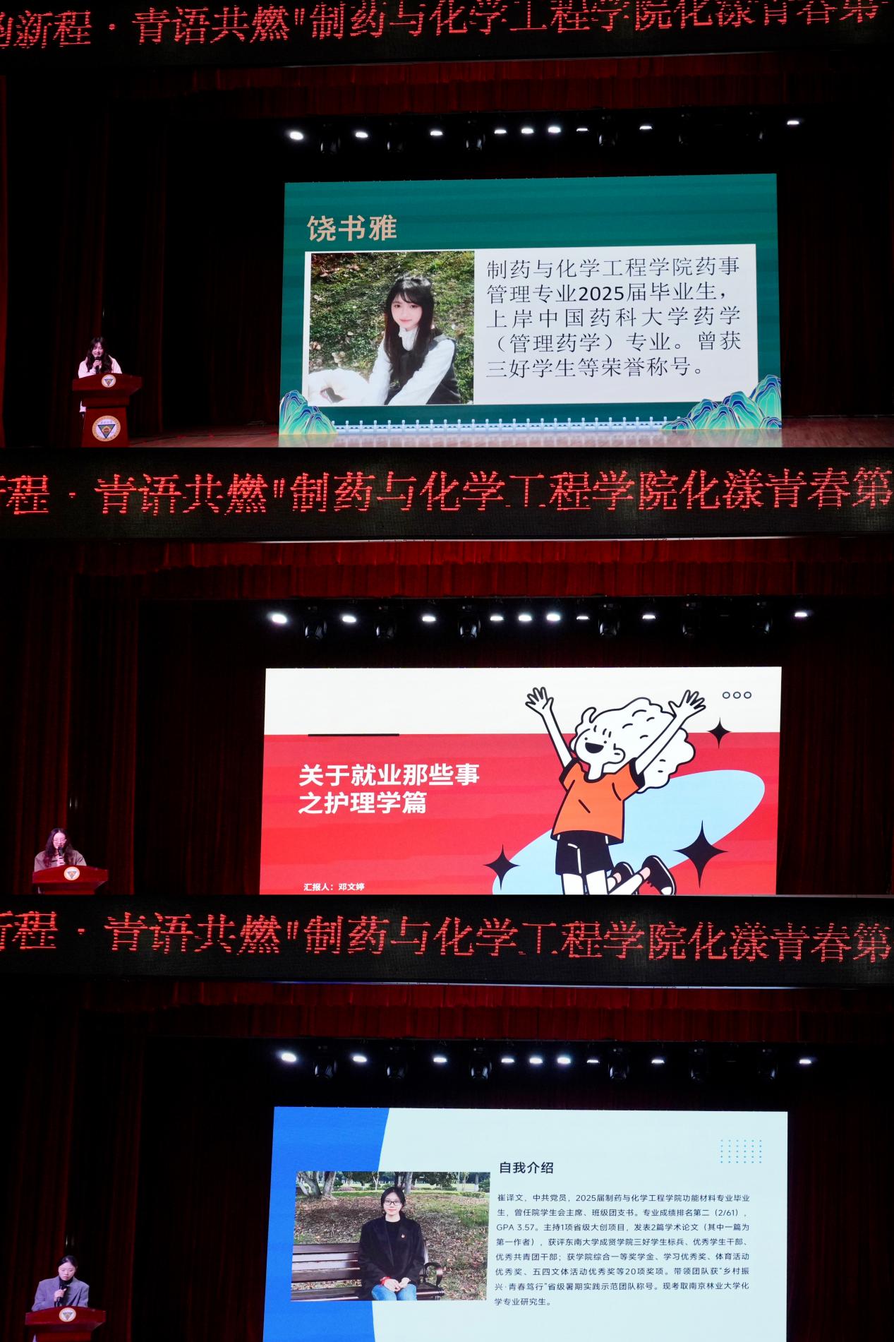 晚会上,学姐们怀揣对大学时光的深切感悟与对学弟学妹的真挚祝福,分享成长历程与奋斗故事。国家奖学金获得者杨雨婷结合自身连续三年绩点4.23、综测96.31的双第一表现、49门课程90+的佳绩及获得多项竞赛奖项经历为新生答疑解惑、指引方向;科创之星梅益仙用绩点4.01、综测96.75的专业双第一成绩与丰硕科创成果,展现竞赛与学术领域的突破之路,干货满满的分享让在场新生受益匪浅。最后,优秀校友代表饶书雅、邓文婷、崔译文受聘为制药与化学工程学院校友导师并现场分享个人考研及就业经历,学院党总支书记周继荣为三人颁发聘书。
