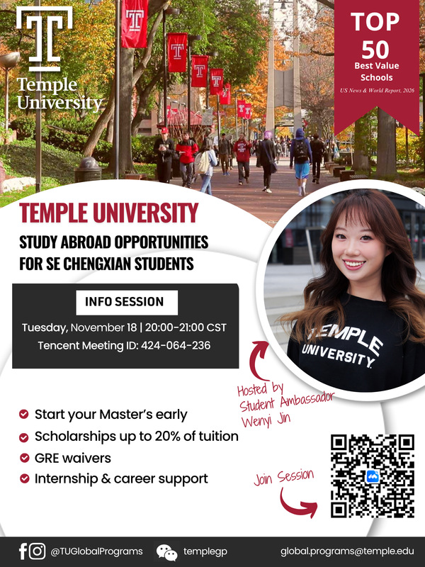 关于参加美国天普大学本硕联合培养(DBMD)3+2和4+2宣讲会的通知