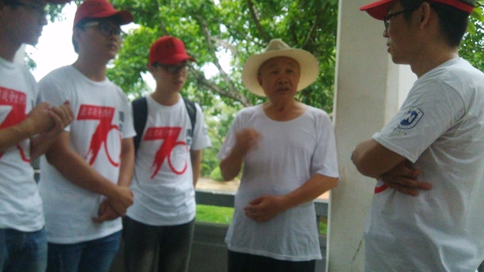 2015年7月20日,必赢国际437官网纪念抗战胜利70周年致远传承寻访团一行10人在海口市人民公园开展抗战七十周年问卷调查活动。活动期间突下暴雨,避雨之时偶遇爱国且博学的孙老先生。
