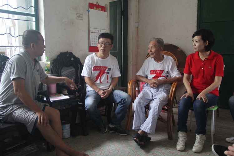 冯记者一行人跟随寻访团来到了云老家中。云老身穿寻访团赠送的纪念衫,对寻访团以及记者的来访表示热烈的欢迎。寻访团同云老围坐在电视机前观看了纪念中国人民抗日战争暨世界反法西斯战争胜利70周年阅兵式直播。虽然年事已高,但云老依旧非常兴奋,非常激动的同我们一起观看直播,并开心地说道:“好啊,好啊,现在国家强盛了,我心里很高兴啊!”。观看过程中,老人怀着激动的心情与寻访团同学及记者一同交流,自豪之情难以言表。中午十一时,阅兵接近尾声,大家纷纷与云老告别,一行人临走之际,云老意味深长地对大家说道:“如今的和平来之不易,你们要好好珍惜,努力学习,敢于实践,将来为祖国的繁荣富强作出贡献!”。