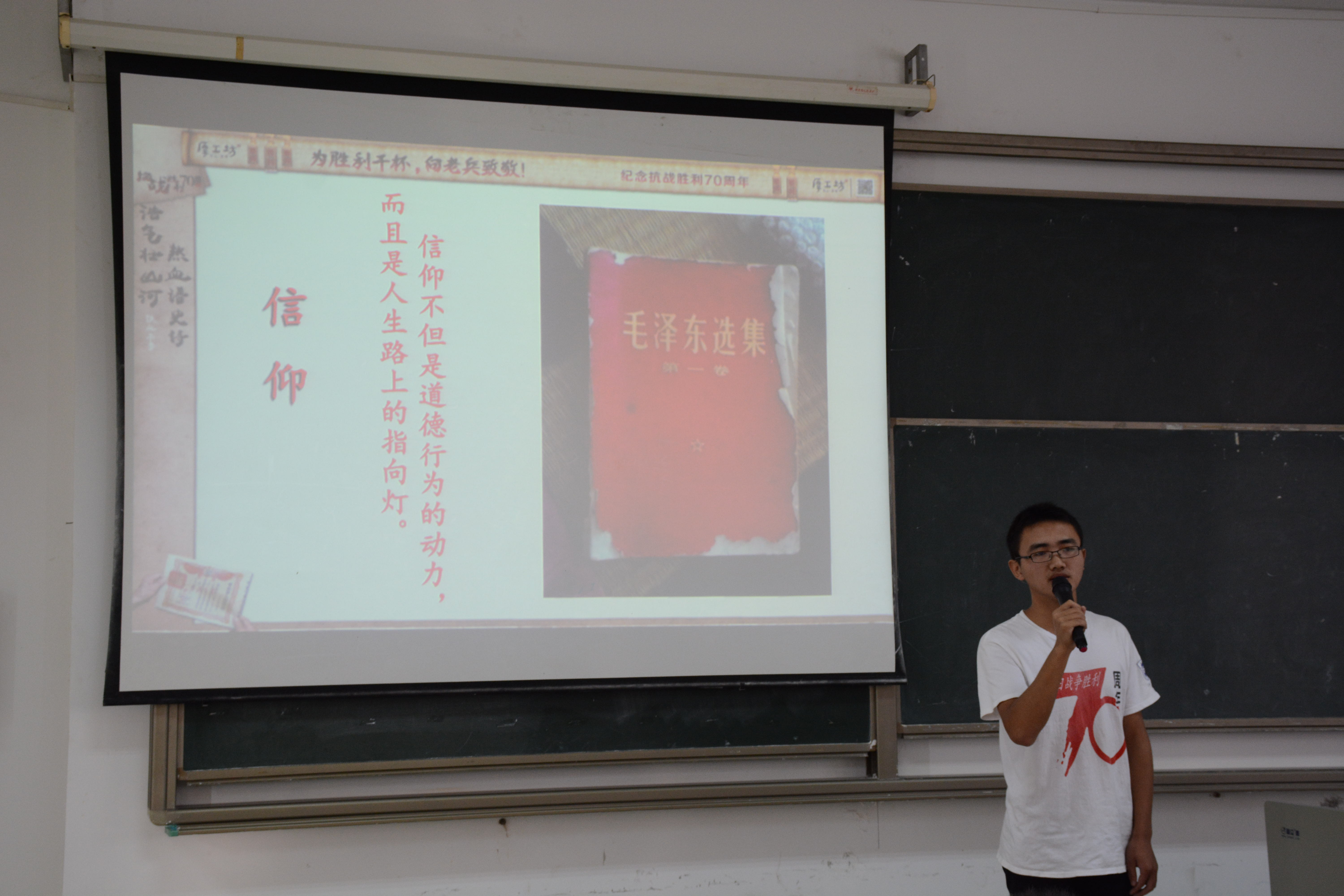 12月13日上午,在3号教学楼212课室,必赢国际437官网“致远传承”寻访团为第十一期党课积极分子带来了一场别开生面的党课——分享了团队暑期纪念抗日战争胜利70周年寻访活动经历、体验和收获。出席活动的有辅导员崔建兵、崔万春老师,分享成员有起家林、朱凯峰、李贺、杨建平、李庆庆等五名同学。会议由机械系第一学生党支部宣传委员金杯主持。