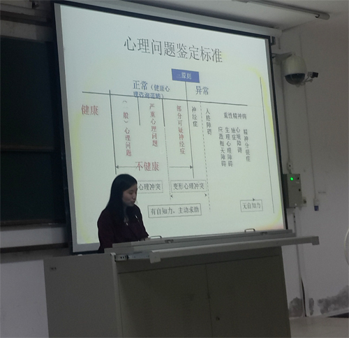 指导教师余梦月对心理委员进行以“关心你周围的同学”为主题的培训。分别从健康新概念、心理工作站介绍、心理委员职责与要求、心理问题形成原因、表现形式与解决对策等四个方面进行讲解。她首先强调,学院心理工作站立足于心理健康知识普及、心理危机预警两项职能,着力在心理能力提升、心理问题解决方面工作,依靠团体的力量,建立“学院工作站—班级心理委员—宿舍联络员”三级联动的运营体系和沟通机制,以期实现心理健康工作的普及率和有效性;其次通过案例分析对当代大学生常见心理问题的主要类型、形成原因、表现形式与解决策略进行讲解与剖析,让同学们对心理工作有了更加形象、具体的认识;最后,推荐了相关书籍与影视作品,增强同学们对心理的兴趣与理解。