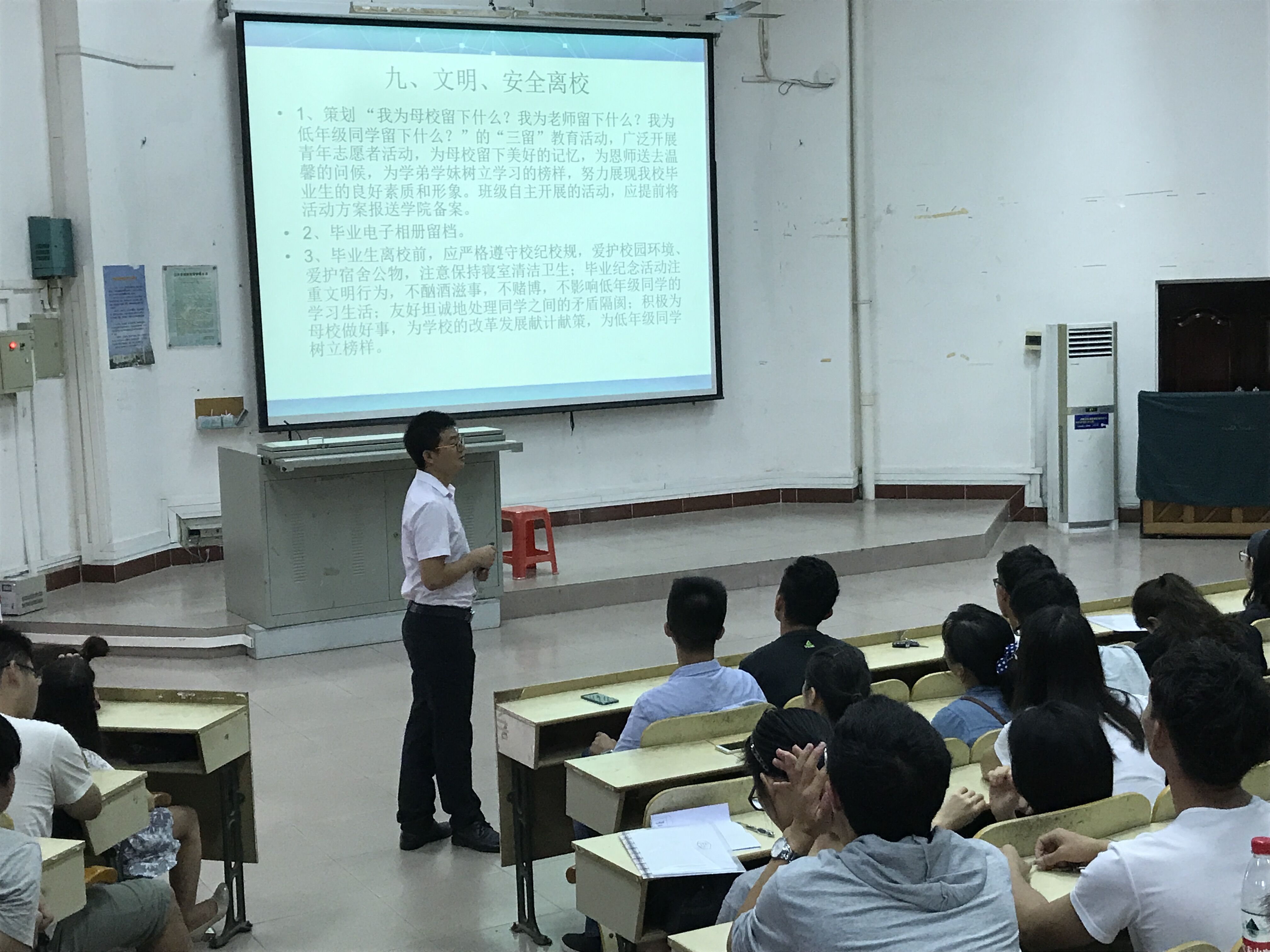 另外,崔建兵老师提醒同学们,毕业生离校要安全、文明。建议毕业生广泛开展青年志愿者活动,为母校留下美好的记忆,为恩师送去温馨的问候,为学弟学妹树立学习的榜样,努力展现我校毕业生的良好素质和形象。毕业生在离校前,应严格遵守校纪校规,爱护校园环境、爱护宿舍公物;友好坦诚地处理同学之间的矛盾隔阂;积极为母校做好事,为学校的改革发展献计献策,为低年级同学树立榜样。