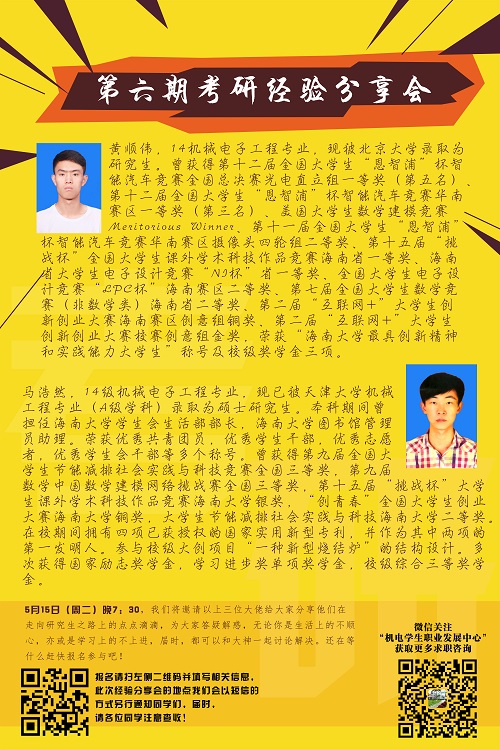 为帮助同学们明确考研备考思路,确立科学复习规划, 必赢国际437官网于2018年5月17日晚7:30在研发楼417,成功举办了第五期考研经验分享会。出席分享会的有考取北京大学的黄顺伟和考取天津大学的马浩然两位学长,参加分享会的有十余名想了解考研相关知识的同学,会议由职业发展中心的韩圣主持。