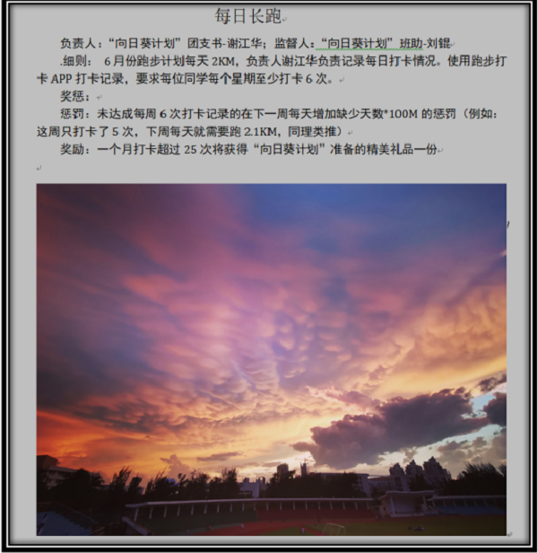 2020年6月15日,“向日葵”一班班委会在研发楼402召开。班主任助理刘锟主持会议,辅导员崔建兵老师出席会议,五名班委参加会议。会上,为让每位同学走出宿舍,展现青春活力,强健体魄,班干部们共同讨论提出每日长跑奖惩制度,并任命“向日葵计划”团支书谢江华为该项目的负责人,班助刘锟为监督人。