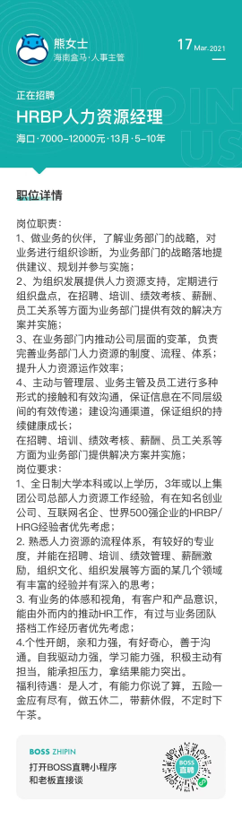 HRBP人力资源经理海口·7000-12000元·13月·5-10年