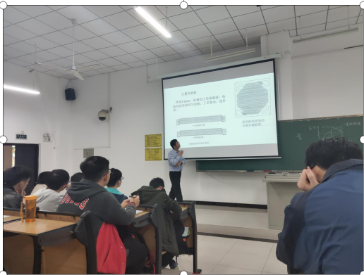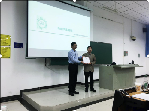 在一片鼓掌声中,活动缓缓拉开序幕。铿锵的声音,生动的语言,丰富的知识和阅历,徐斌教授凭借自身讲课魅力,牢牢吸引住众师生的眼球。其将混合动力电动汽车设计作为课题主线,以电动汽车的分类、关键技术以及发展现状作为开端,分别介绍了电动汽车动力电池和能量存储系统,包括电池分类、工作机理、管理系统及使用维护,以及电动汽车驱动电机的分类和选型原则、纯电动汽车整车设计方法等内容。在讲述过程中,徐斌教授也友好地同学生们讨论车辆动力学基础,包括车辆纵向动力学和车辆传动装置动力学等方面的知识,并阐述混合动力驱动系统设计原理和控制策略,同学们受益匪浅。徐斌教授还对学生提出三点希望:第一,希望同学们多阅读,扩大知识面,提升专业技能;第二,希望同学们能独立思考和分析问题;第三,希望同学们能将所学专业与社会需求相结合,注重实际技能的培养。