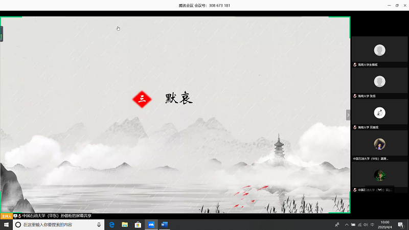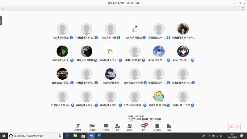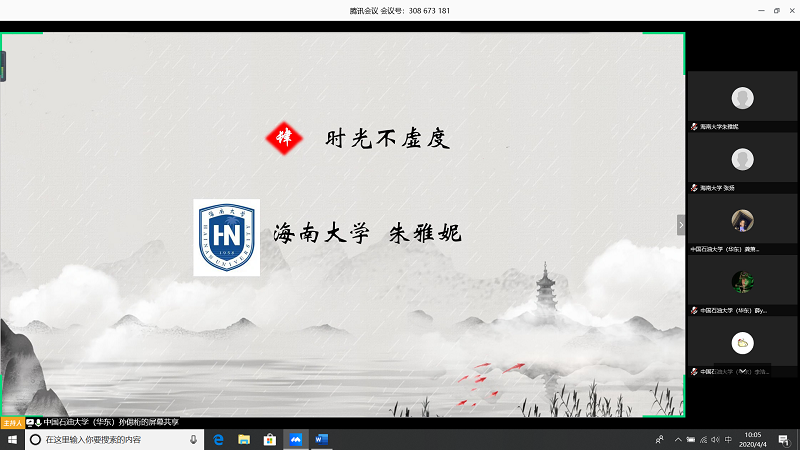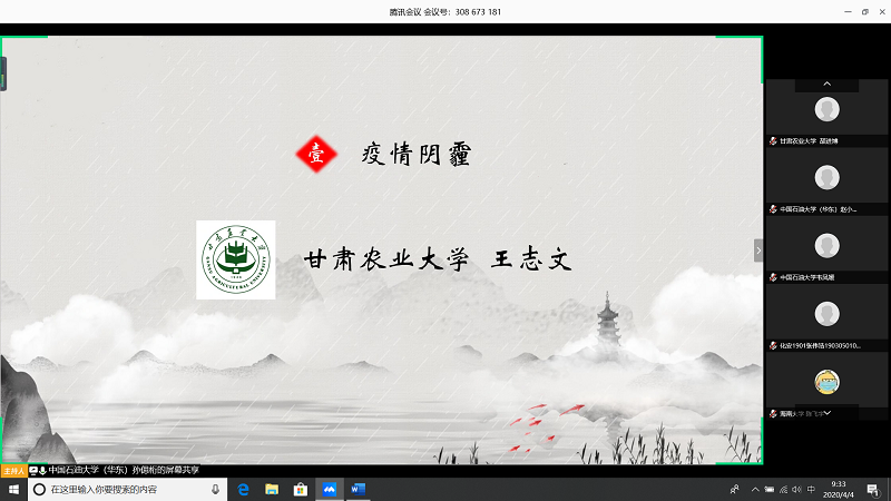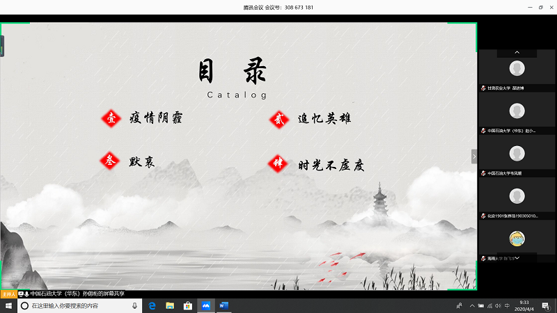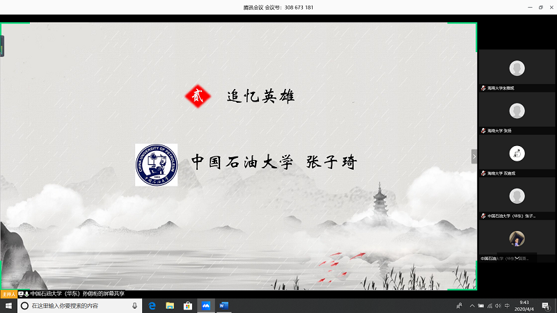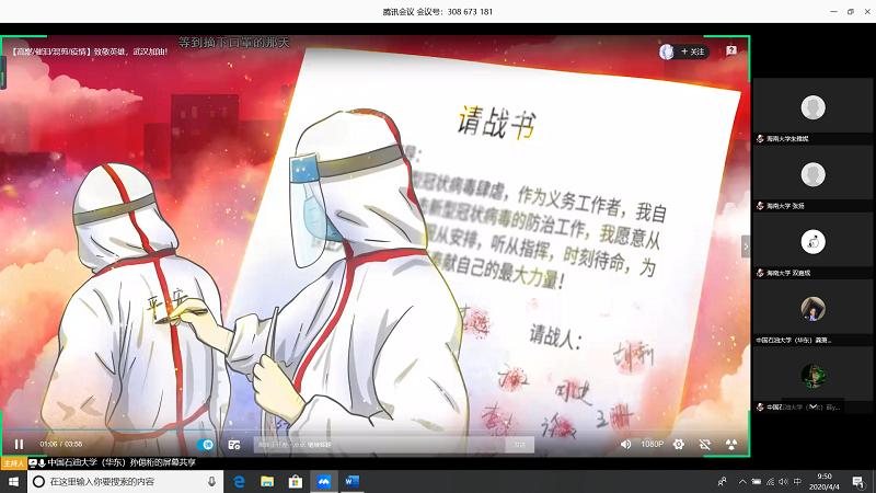 会上,由甘肃农业大学王志文同学带我们回顾疫情,虽然国内疫情已经有所缓解但是同学们还是不能放松警惕;中国石油大学(华东)张子琦同学带领大家向抗疫英雄致敬,十点开始全体起立默哀三分钟;必赢国际437官网朱雅妮为大家强调线上上课等同于课堂教学,在家学习不能懈怠,合理规划疫情期间的学习和课程安排。