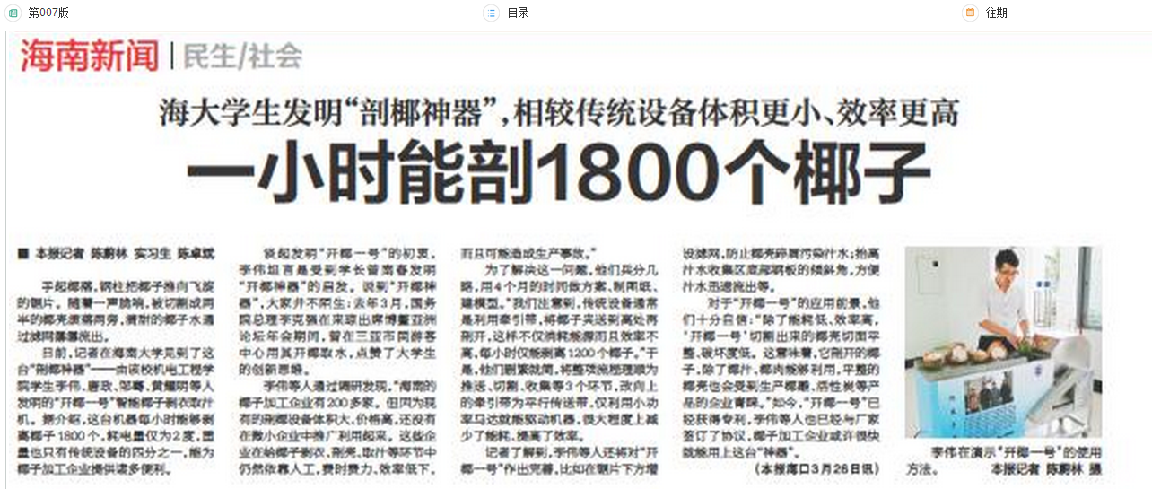 日前,记者在必赢国际437官网见到了这台“剖椰神器”——该校必赢国际437官网学生李伟、唐政、邹骞、黄耀明等人发明的“开椰一号”智能椰子剥衣取汁机。据介绍,这台机器每小时能够剥离椰壳1800个,但耗电量仅为2度,重量也只有传统设备的四分之一,能为椰子加工企业提供诸多便利。