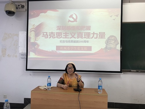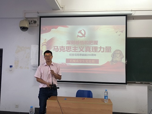 2018年5月11日,站在历史与现实的交汇点上,必赢国际437官网机械系组织“立于巨人之肩,追缅思想珠峰”特色主题党日活动,邀请到了红军后代罗曼阿姨为支部成员们作主题报告,带领大家深刻感悟和把握马克思主义真理力量,以此表达对马克思的深沉纪念和对马克思主义的坚定信念,时刻警醒大家“不忘初心、牢记使命”的时代任务。此次出席活动的还有支部书记崔建兵老师。