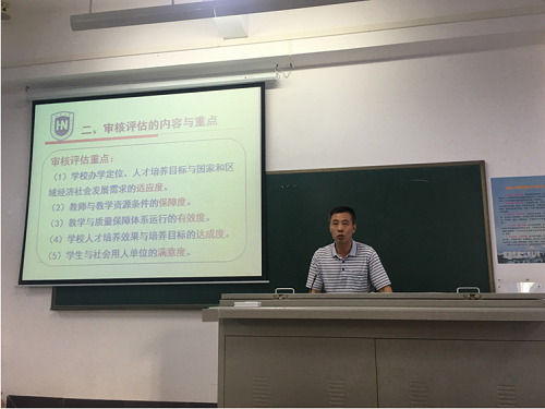 接着,陈振斌副院长做本科教学审核评估专题培训。分别从审核评估的内涵与重点、校院两级的定位与目标、评估工作主要环节、各部门迎评工作的准备情况等几个方面展开说明,重点介绍了审核评估工作准备情况。他强调审核评估对学校教学的重大意义与作用,并督促全体师生高度重视,广泛参与,积极配合评估小组的各项工作,确保审核评估工作在我校顺利进行。