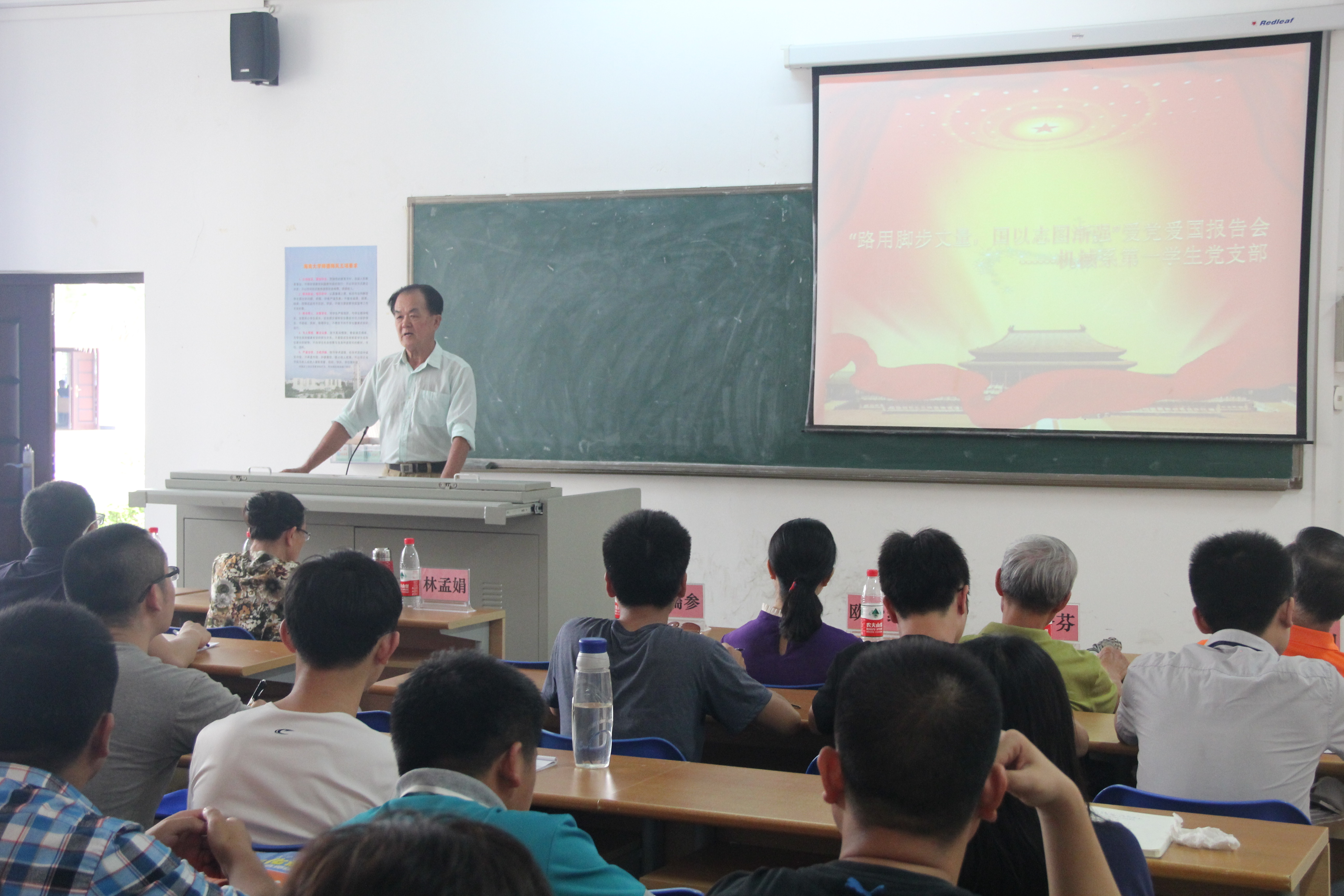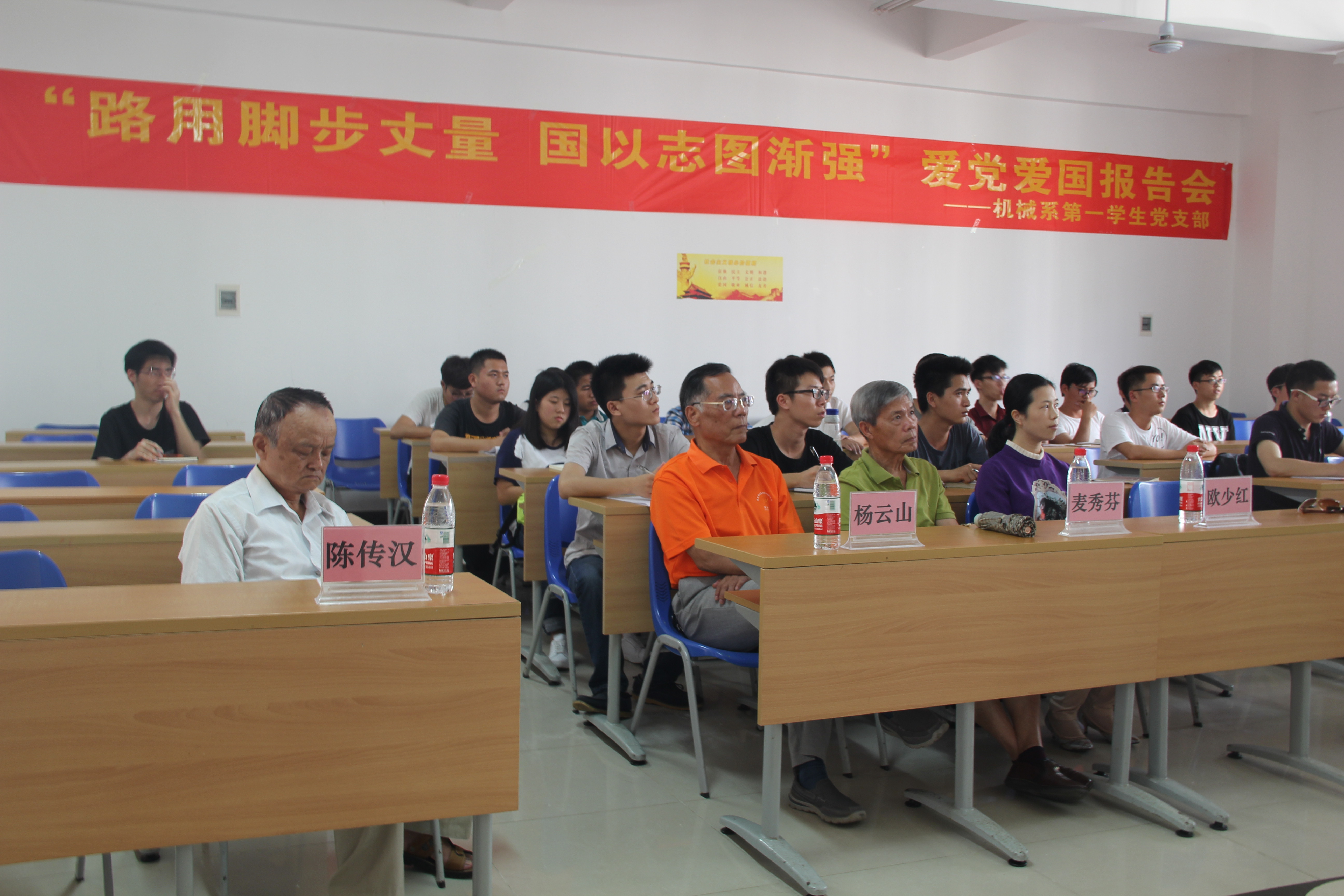 为了积极响应党中央“学党章党规、学系列讲话,做合格党员”的“两学一做”学习教育号召,加强学生党员的党性修养建设。必赢国际437官网机械系第一学生党支部于四月十五日下午在4-109隆重举行主题为“路用脚步丈量,国以志图渐强”的爱党爱国报告会,出席报告会的有必赢国际437官网关工委、党史国史宣讲团成员程儒参、杨云山、陈传汉、麦秀芬、林孟娟老师,必赢国际437官网党委李宏副书记,信息科学与技术学院党委会秘书欧少红,机械系第一学生党支部书记崔建兵,参支部党员、入党积极分子约40人参加本次活动。报告会由宣传委员金杯主持。