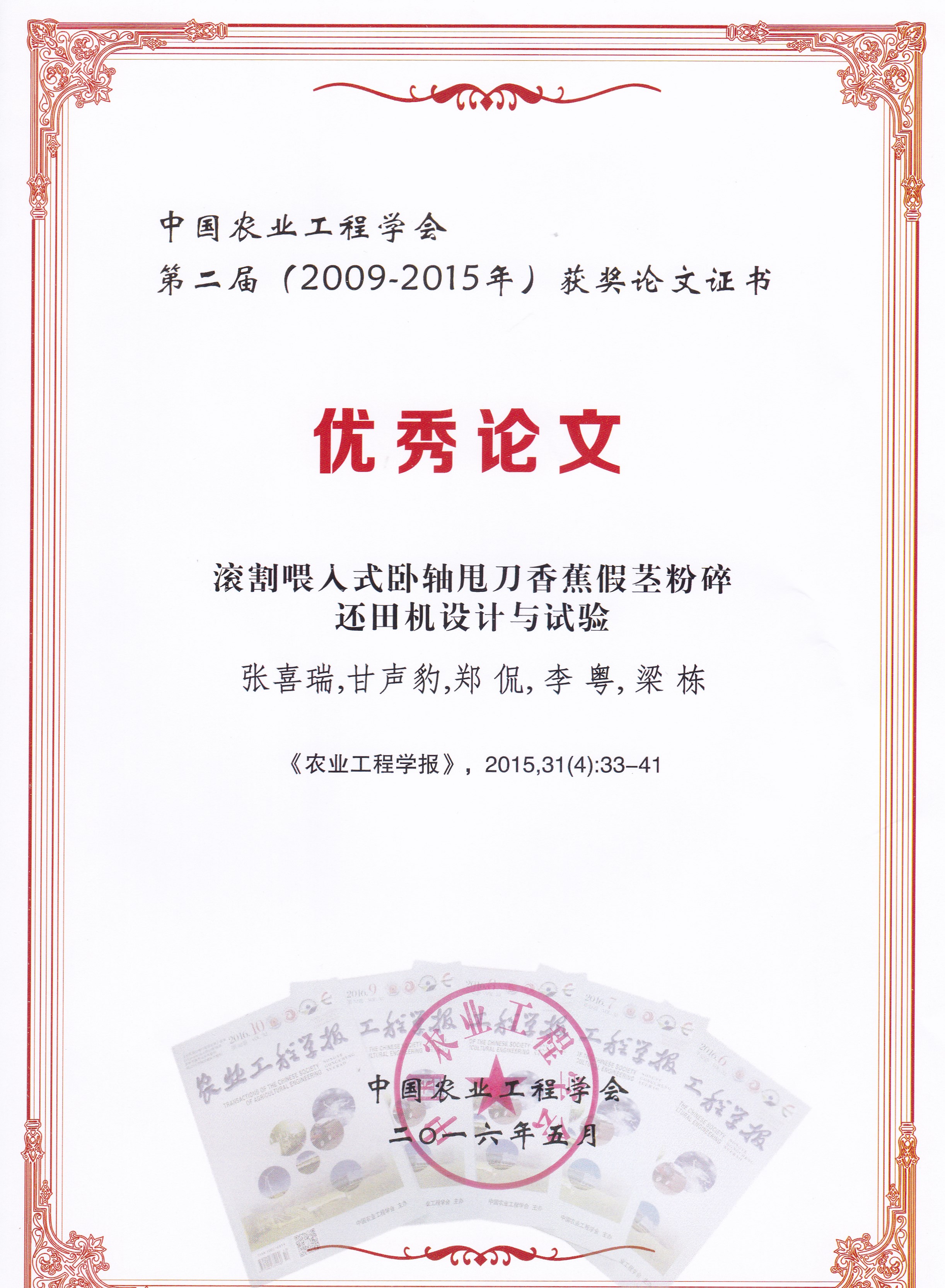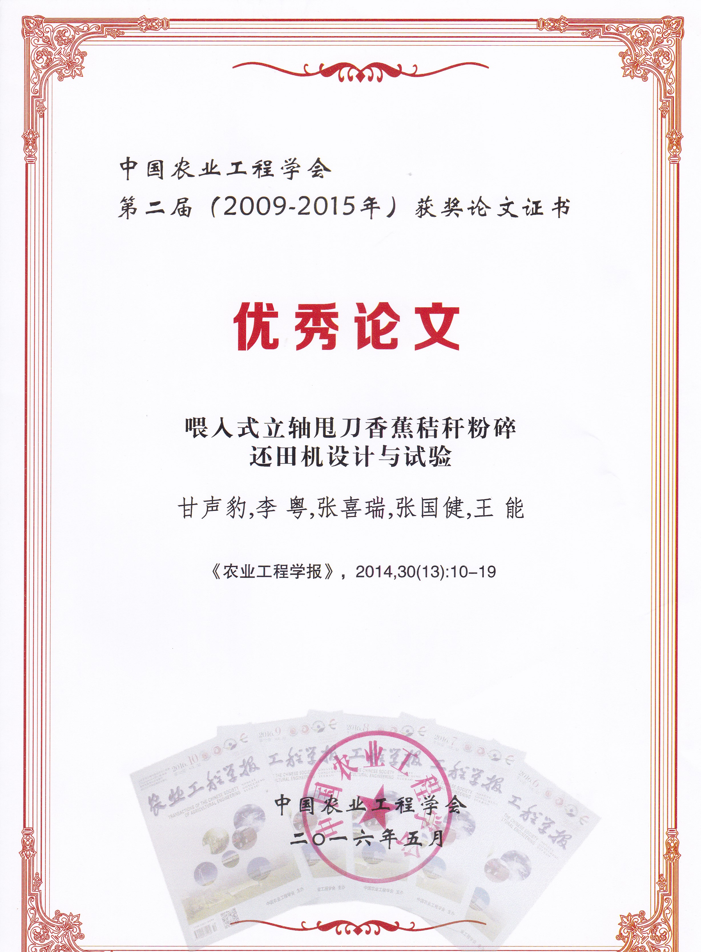 近日,必赢官网热带作物秸秆机械化技术课题组两篇《农业工程学报》论文入选“中国农业工程学会第二届优秀论文”。两篇论文分别是“滚割喂入式卧轴甩刀香蕉假茎粉碎还田机设计与试验”(通讯作者:张喜瑞副教授)、“喂入式立轴甩刀香蕉秸秆粉碎还田机设计与试验”(通讯作者:李粤教授)。继2009年中国农业工程学会第一届优秀论文评选后,中国农业工程学会今年启动了第二届优秀论文评选。本届优秀论文评选范围是《农业工程学报》2009-2015年刊发的论文,优秀论文遴选采用文献指标定量与发表时专家评审意见定性相结合,提出候选论文,由中国农业工程学会组织专家评审。