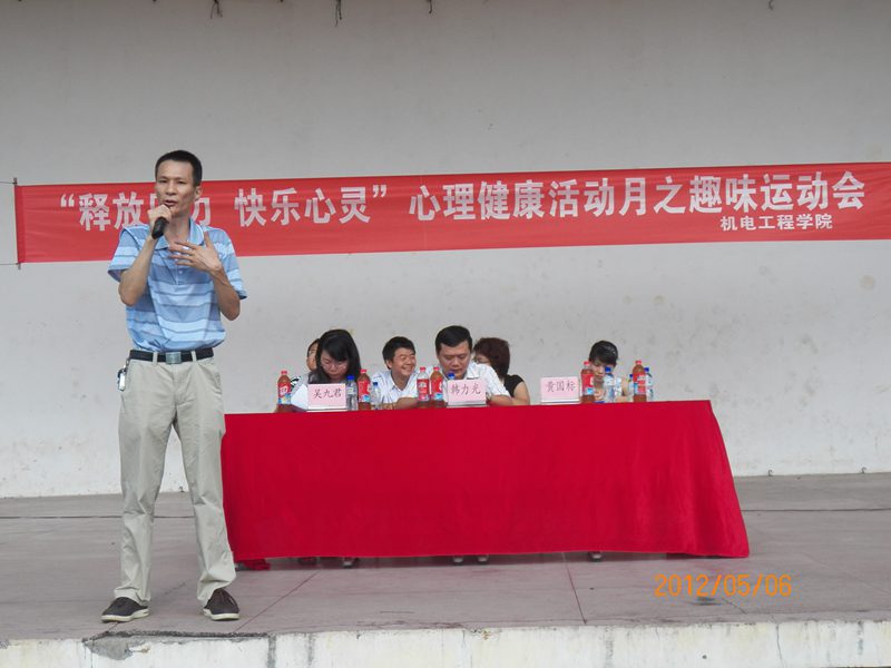 为了焕发同学们的运动激情,塑造一颗健康的心灵,构建一个和谐的校园。必赢国际437官网在这个阳光灿烂的五月迎来了心理嘉年华趣味运动会暨心理健康活动月开幕式。出席本次心理嘉年华趣味运动会的嘉宾有:学生处韩力光副处长,学生处心理健康教育指导中心吴九君博士,院党委黄国标副书记,学工办主任陈秀妍老师,何映敏、崔建兵、姚广龙老师以及必赢国际437官网2010级和2011级全体学生。