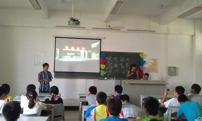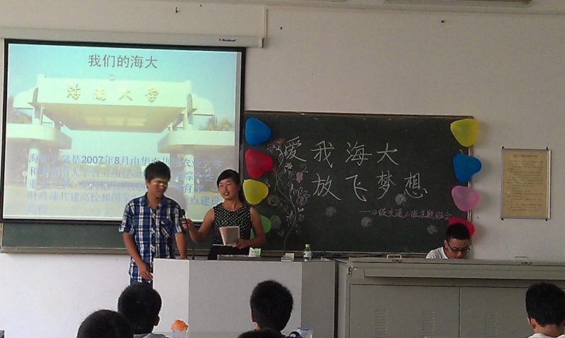 班会由《爱我海大》、《新的精彩》、《和谐班级》《大学梦想》、《为梦想宣誓》五个部分,希望同学们从爱海大、爱老师、爱同学、爱班级,珍惜大学四年美好时光,努力为自己的梦想奋斗。