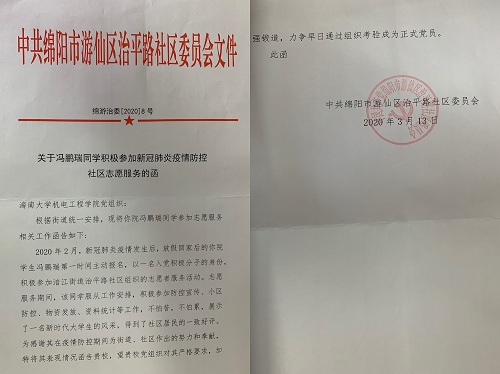 冯鹏瑞,必赢国际437官网2018级机械电子工程专业学生。新冠肺炎疫情暴发后,该生得知辖区街道办在招募志愿者,便第一时间报名参加了志愿者。随后被分配到了治平路社区,和社区的工作人员一起到小区配合物业给居民办理出入卡登记证,给出入小区的人测量体温,对没有出入证的人进行劝解,到附近广场当志愿者,发放宣传资料,劝告居民外出一定要佩戴口罩、不要在公共场所逗留聚集,尽量宅在家里,因为这既能保障自己和家人的安全,又可以不给国家和社会添麻烦。他说道:“作为一个大学生可以为疫情防控做一点事情,贡献一点力量,我感到非常荣幸。”