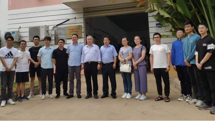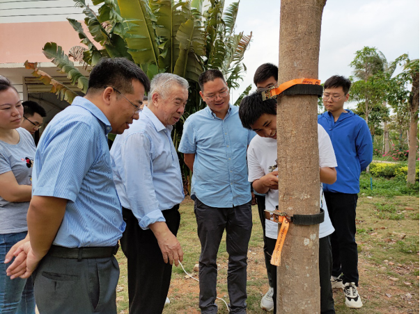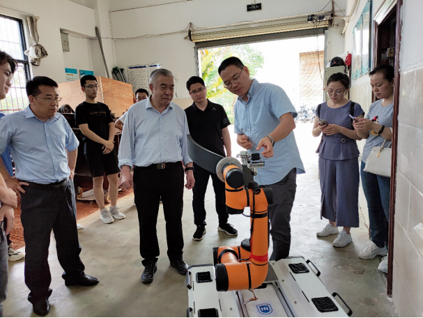 座谈会后,陈学庚院士参观了必赢官网农机实验室,张喜瑞教授对农机团队的科研情况进行了汇报和实机展示,着重介绍了智能化割胶装备的研发进展,陈学庚院士肯定了农机团队的工作,并就展示的两种割胶装备提出了改进方案。