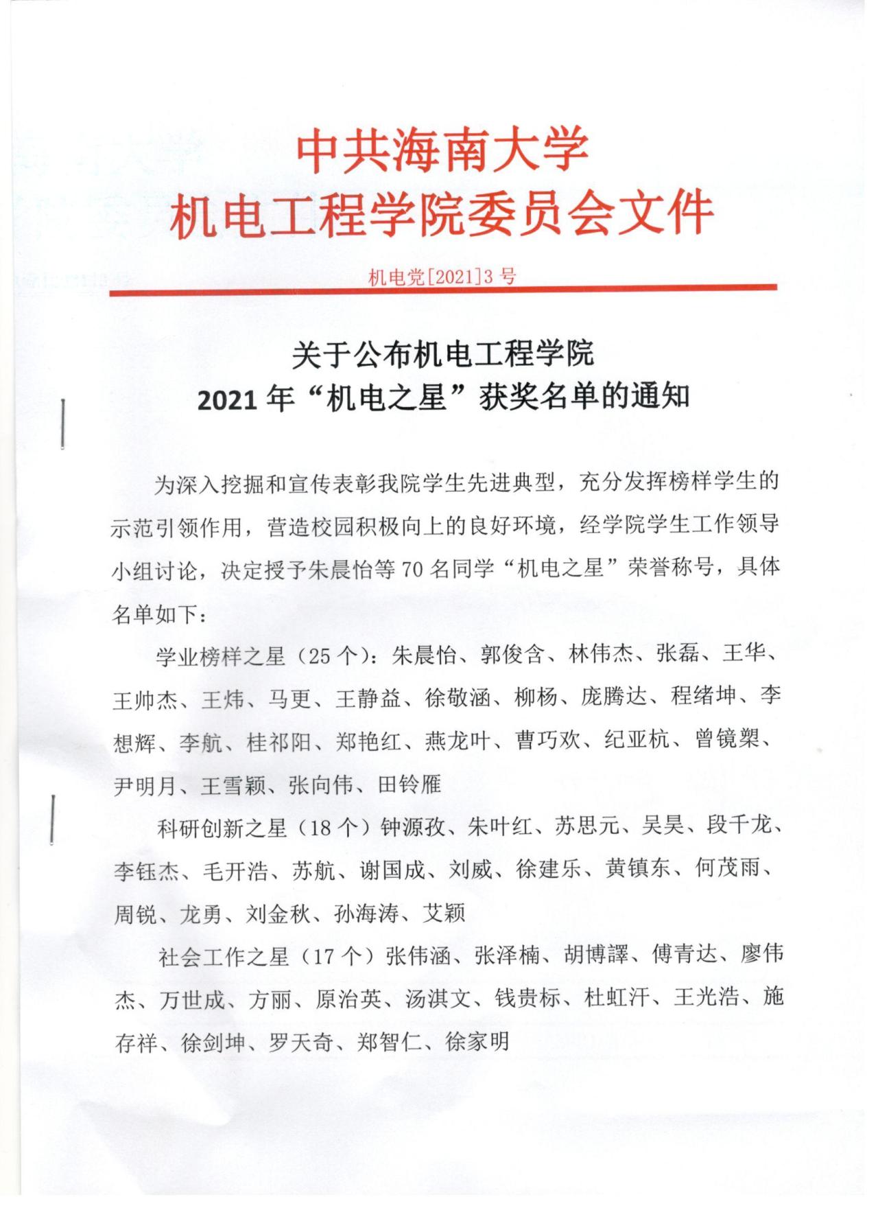 关于公布必赢国际437官网2021年“机电之星”获奖名单的通知
