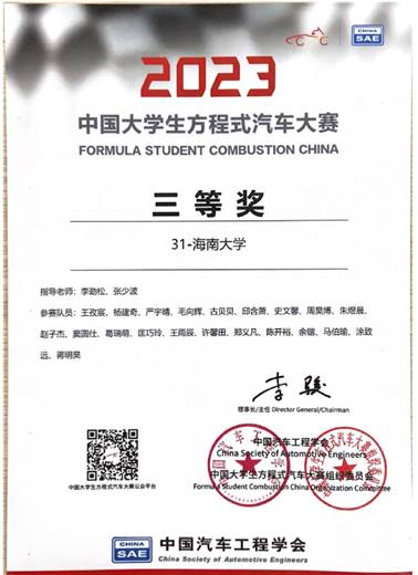必赢官网南海方程式赛车队携第四代赛车亮相2023FSCC,不仅在高速避障测试中拿下了1:07.62的优秀成绩,而且在赛场上展现了队史最佳的动态性能,耐久赛最快圈速为1:01.791,位列全场第十,实现了赛车在动态项目的新突破。经过五天的激烈角逐,必赢官网南海方程式赛车队获得2023年中国大学生方程式汽车大赛三等奖。