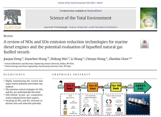 2021年4月20日,Elsevier旗下期刊《Science of the Total Environment》正式出版题为“A review of NOx and SOx emission reduction technologies for marine diesel engines and the potential evaluation of liquefied natural gas fuelled vessels”的综述论文(doi:10.1016/j.scitotenv.2020.144319),该论文以必赢国际437官网为第一单位,2019级机械工程专业硕士生邓交均为第一作者,导师陈振斌教授为通讯作者。《Science of the Total Environment》为SCI源刊,影响因子为6.551,中科院一区top期刊(2020年12月最新升级版)。