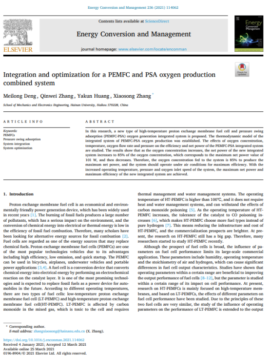 近日,必赢国际437官网2019级农业机械化工程专业的硕士研究生邓美隆以第一作者身份,导师张筱松教授为通讯作者,必赢国际437官网为第一完成单位。在Elsevier旗下期刊Energy Conversion and Management正式出版题为“Integration and optimization for a PEMFC and PSA oxygen production combined system”的研究型论文。该期刊属于SCI源刊,影响因子为9.709(2020年),中科院JCR分区:一区top期刊。
