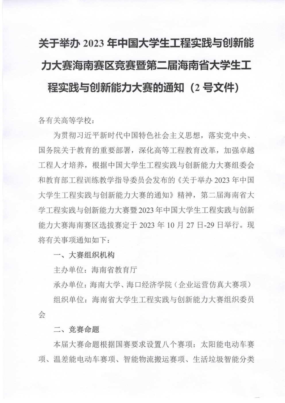 关于举办2023年中国大学生工程实践与创新能力大赛海南赛区竞赛暨第二届海南省大学生工程实践与创新能力大赛的通知(2号文件)