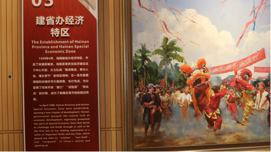 第三层《扬帆奋进》展区着重于展示海南近代的发展从海南省解放,到建省办经济特区,再到国际旅游岛建设和探索建设中国特色自由贸易港的光辉历程。让党支部成员清晰认识到一代又一代人的坚守初心,经过70年的披荆斩棘、砥砺奋进,给海南带来了天翻地覆的变化——从落后边陲海岛一步一步走到全国改革开放重要窗口与转折点。
